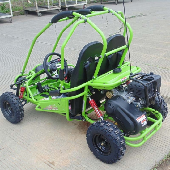 Det er et dobbelt sete, fullt opphengsbuggy barn utstyrt med 163cc, 5,5hp motor elektrisk start med trekk start sikkerhetskopiering og har tohjulsdrift og centrifugalkobling, enkel i kontroll med stopp / gå fotpedaler.